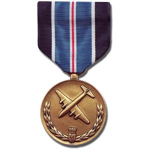 The Humane Action Medal recognizes those military service members who performed extended duty in support of the Berlin Airlift. The medal is based on the design of the Airlift Device.To be awarded the Medal for Humane Action a service member was required to have performed over 120 days of duty, within the geographical boundary of Berlin, with such duty being in support of the Berlin Airlift between the dates of June 26, 1948 and September 30, 1949. Those so qualifying were also eligible for either the Army of Occupation Medal, or the Navy Occupation Service Medal, and both medals were authorized for simultaneously award and display.