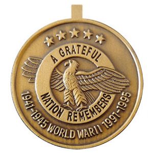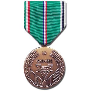 This 50th Anniversary of Victory in Europe Commemorative Medal was developed to be given to all veterans of WWII that were involved in the European Theater. The medal's design incorporates the flags of the major Allied powers, and uses the "V" for victory, a familiar symbol in occupied Europe.