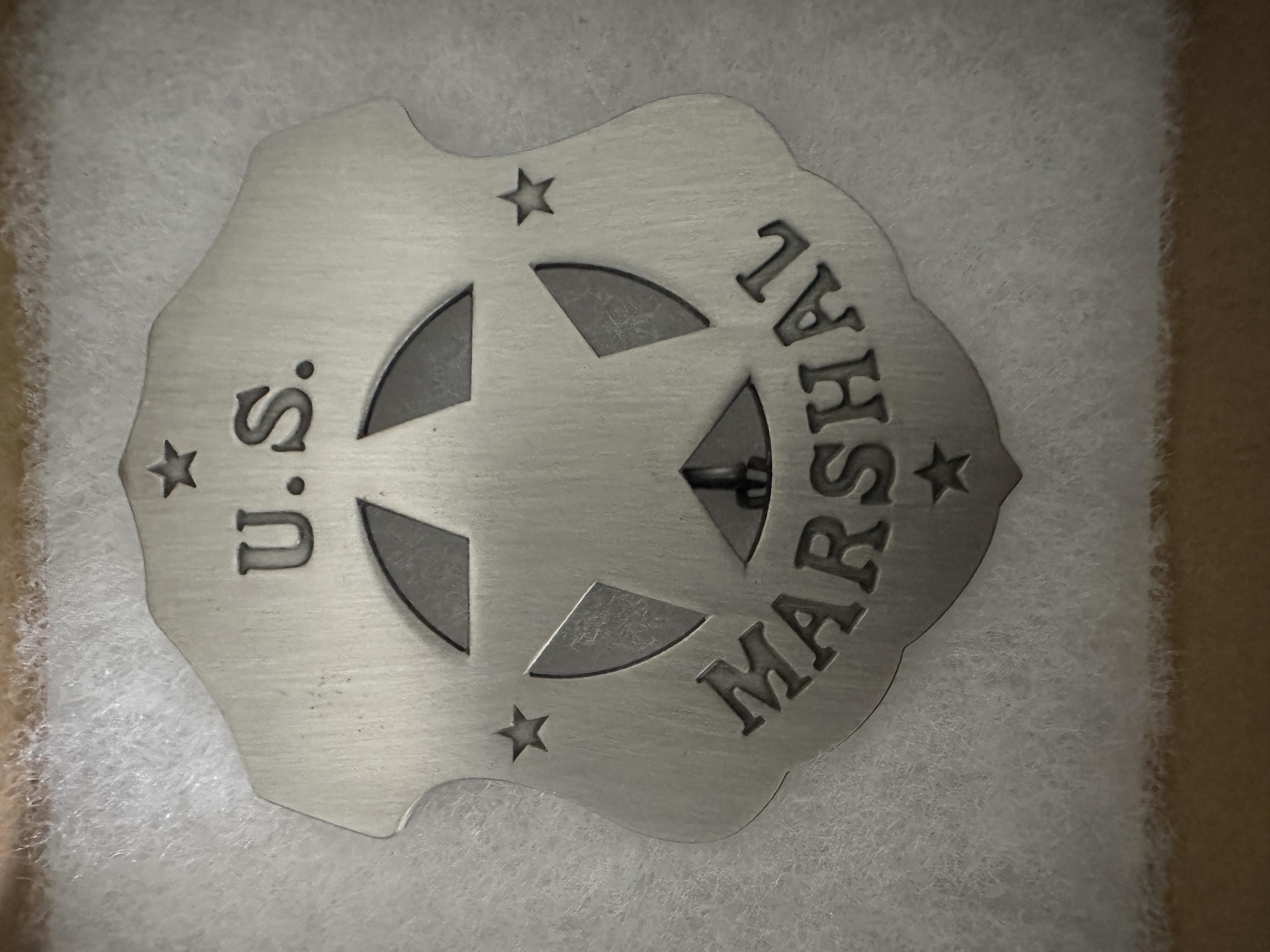 I couldn’t be more pleased with the quality of the replica Marshal Dillon Badge I ordered and received from Pieces of History. Even as I watch the reruns of Gunsmoke, I compare the replica badge to the one James Arness is wearing on the show and cannot believe the authentic resemblance. This is no cheap fake either. It is made of heavy polished materiel, sure to last.